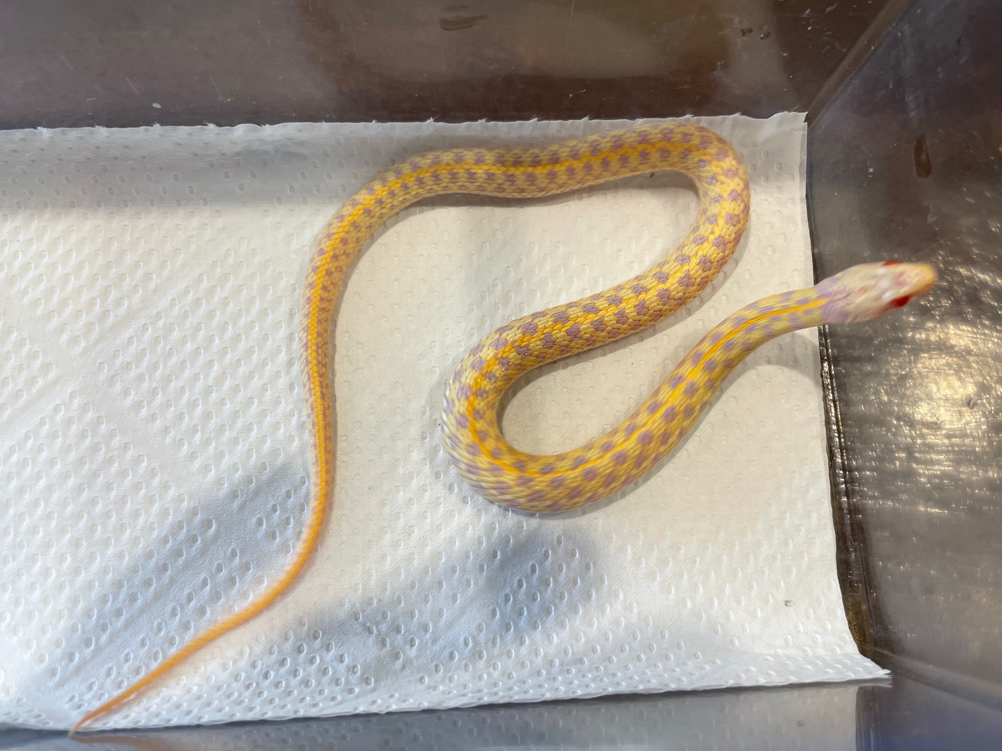 ガータースネーク特有の顔つきと体つきにアルビノのカラーリングが相性良く非常にかっこいいです。