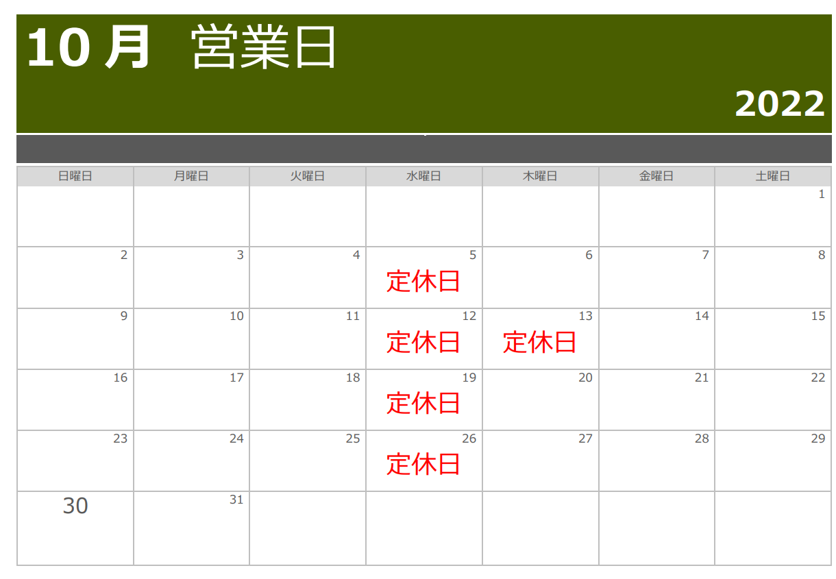 2022年10月営業日カレンダー