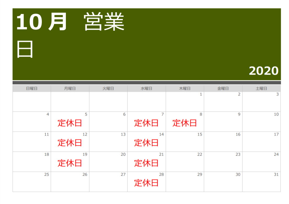 2020年10月営業日カレンダー