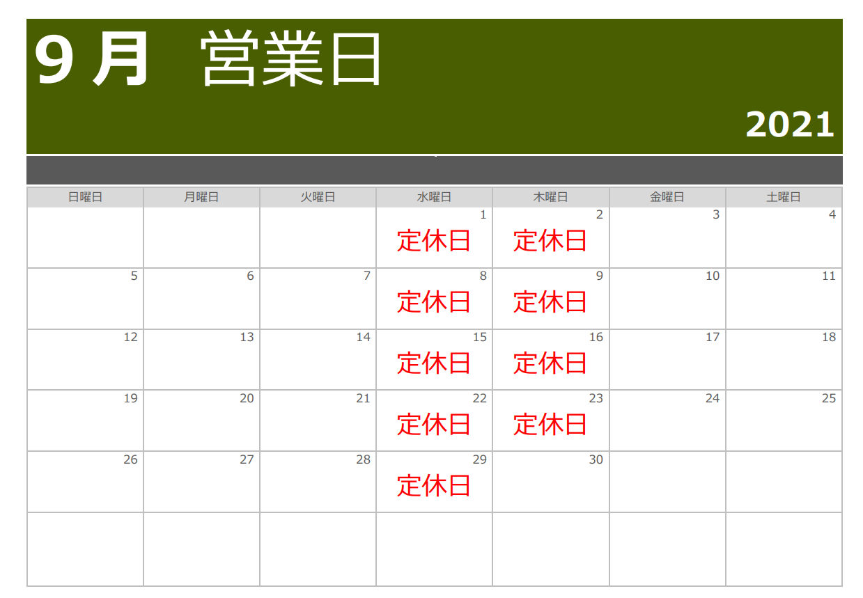 2021年9月営業日カレンダー