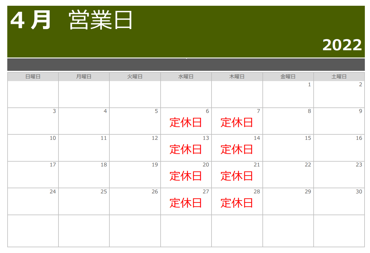 2022年4月営業日カレンダー