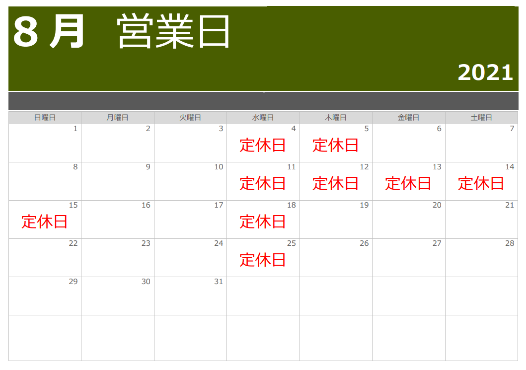2021年8月営業日カレンダー
