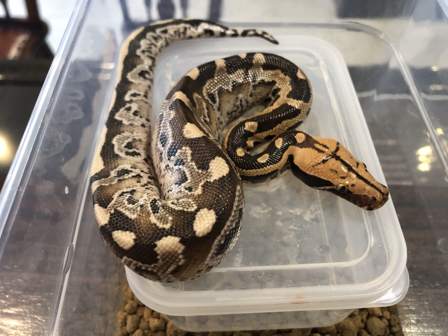 最大全長はボールパイソンなどとそれほど変わりませんが、太さのおかげで非常に迫力あるルックスです。